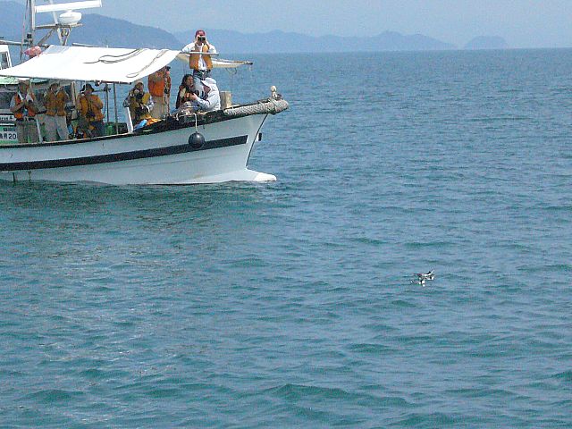 そして,近くの港から3隻の船に分乗しました。たまたま昔ながら鳥仲間の人と同乗となり,楽しく出港です。