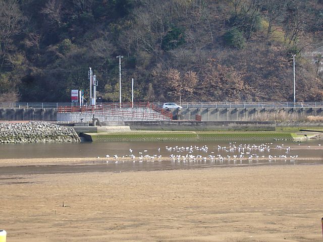沼田川にある防災ステーションの対岸に行くと,ちょうど潮が引いていたためカモメの群れが休んでいました。