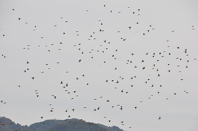 そんなに鳥影は濃くなかったのですが,車で走っていると電線にずらっとならぶ小鳥が目に入ってきました。双眼鏡で観ると,アトリでした。アトリは耕したばかりの田にも降りていて,田んぼの中にもオレンジ色が見えます。そのアトリが急に飛び立ちました。思ったより多くて400羽〜500羽ぐらいいるでしょうか。