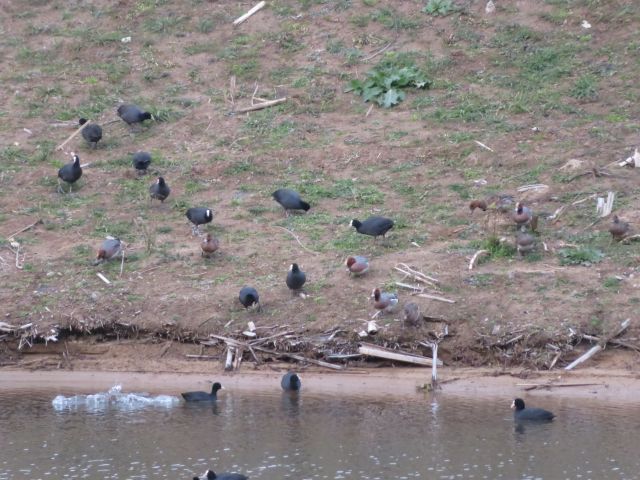 今回の調査では,カモの他にカイツブリ類やカワウ,オオバンも調査しています。オオバンは増加傾向にあり,今年は30羽を超えました。ヒドリガモと仲良く岸に上がって,植物を食べている個体もいました。