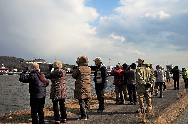2017/01/22 広い広い冬の笠岡干拓地と芦田川河口(写真は,芦田川) 前回の西条市と入れ替えて行った笠岡の探鳥会です。 天気はとてもよかったものの風が強い1日だったそうです。 上の写真は,福山市「芦田川河口」で観察中のものです。