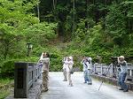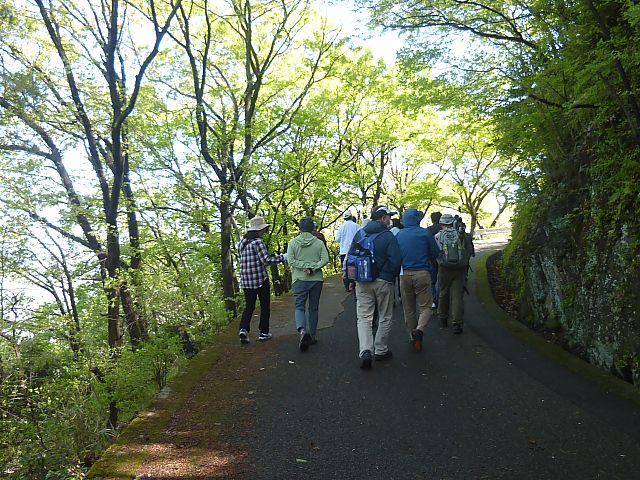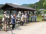 | ○3年ぶりに三次市作木町や島根県の「三瓶山」に行きました。 今回,私は所要のため参加できませんでしたが,Iさんより2日間の様子や写真を送っていただきました。Iさん,どうもありがとうございました。 <以下,Iさんのメールを引用> --------------------------------------------------------------------------------------------- 6月11日から12日にかけて、泊りがけで出かけた、三瓶山探鳥会について報告いたします。 今日から泊りがけで、三瓶山へ探鳥に出かけます。 参加は24名、6台の車に分乗して中央公民館を出発しました。途中、三次市内でお昼のお弁当や、懇親会の飲料、お菓子を購入して、まず第一目的地の三次市作木町の「川の駅常清」につきました。川の駅の近くの橋にイワツバメが営巣していて、たくさんのイワツバメを見ることができました。少し早いですが、ここで江の川の流れを見ながら昼食をとりました。 ここから少し離れたブッポウソウの観察小屋があるところに移動して、探鳥を開始。幸い巣箱に入るブッポウソウや周囲を飛ぶブッポウソウを観察することができました。作木町内では、あちらこちらに巣箱が見られ、町をあげてブッポウソウを保護する様子がわかりました。 おまけですが、観察小屋の側を流れる谷川で、大きなオオサンショウウオを見ることができたり、谷川でカジカガエルが観察できたり、田んぼの周りの石垣にモリアオガエルの卵塊があったり、本当に自然環境の良い場所でした。 ここから江の川を下って、三瓶山に向かいます。江の川から離れて、山をどんどん登ると、三瓶山のふもと西の原に着きました。ここは広い草原で、ヒバリやセッカがさえずる声が聞こえます。だだ草原が広すぎて、かろうじてヒバリの姿は見つけられましたが、セッカはできませんでした。 このあと、本日の宿泊地の北の原「国立三瓶青少年交流の家」に向かいました。駐車場に着くと いきなり「キョロロロロー」のアカショウビンの声がお出迎え。その他、イカルやクロツグミ声が聞こえたり、探鳥には申し分がない場所です。「国立三瓶青少年交流の家」のオリエンテーションを受け、部屋に荷物をおろし、午後の探鳥に山麓に向かいました。ここでは、コガラ、ヒガラなどの平地にいないカラ類の鳴き声や一瞬ですが姿も見れたり、一部の人はサンショウクイの姿を見ることができました。もう少し見ていたかったのですが、夕方のつどいに参加する必要があり、急いで宿に戻ります。少しも青少年でない私たちのグループは、他の大多数であるスポーツ系青少年の合宿グループに囲まれて、大丈夫なのかと思いましたが、他にも歳を重ねた方がいる団体もいることが判り、安心しました。 夕方のつどいの後、バイキング形式の夕食をとり、夕方の探鳥に出かけます。出かける前に宿の前の草原に動物を発見。タヌキかと思いましたが、アナグマでした。アナグマは一生懸命何かを食べている様子。しばらく草原にいてくれ、しっかり観察 することができました。この後、北の原の草原まで出ると、カッコウの鳴き声が聞こえ、日が暮れたため宿に 戻りました。 入浴後の懇親会では、今年の計画を変えて、コウノトリを見に行こうとか、いろいろ盛り上がった話ができました。 1日目の観察種: (作木町、三瓶山での観察) ホトトギス、ツツドリ、カッコウ、トビ、アカショウビン、ブッポウソウ、コゲラ、サンショウクイ、サンコウチョウ、 カケス、ハシボソガラス、ハシブトガラス、コガラ、ヤマガラ、ヒガラ、シジュウカラ、ヒバリ、ツバメ、コシアカツバメ、 イワツバメ、ヒヨドリ、ウグイス、ヤブサメ、エナガ、メジロ、セッカ、クロツグミ、キビタキ、オオルリ、スズメ、 キセキレイ、セグロセキレイ、カワラヒワ、イカル、ホオジロ、アオサギ、ミサゴ、カワウ、ハクセキレイ 以上 39種<ソウシチョウ>は外来種として観察 2日目は、早朝5時からの探鳥で、山麓に向かいます。朝早いのですが、全員参加です。宿を出てすぐ、まだトラツグミが鳴いています。アカショウビンの声を聞いた方もあったようです。昨日の午後探鳥をした、山麓の分岐のところまで来るとサンコウチョウの鳴き声が。ずっと鳴き続けてくれたのですが、姿は見つけられませんでした。また、期待のクロツグミはあまり鳴いてくれませんでした。 朝のつどいに参加するため、宿に戻ります。朝のつどいでは、何十年ぶりでしょうか?ラジオ体操を行いました。朝食後、部屋の掃除を済ませ、最後の探鳥に向かいます。夏鳥を見るのは難しいのですが、どうも鳴き声ばかりで、鳥の姿はあまり見ていません。キビタキもいたるところで鳴いているのですが、茂った木々の間で、いまいち姿が見れませんでした。でも何とか見たい。1か所で粘っているとやっと姿を見せてくれました。それも縄張り争いをしているのか、同じところを何度も往復してくれて、参加者全員、もれなく姿を見ることができました。この後、北の原に向かって