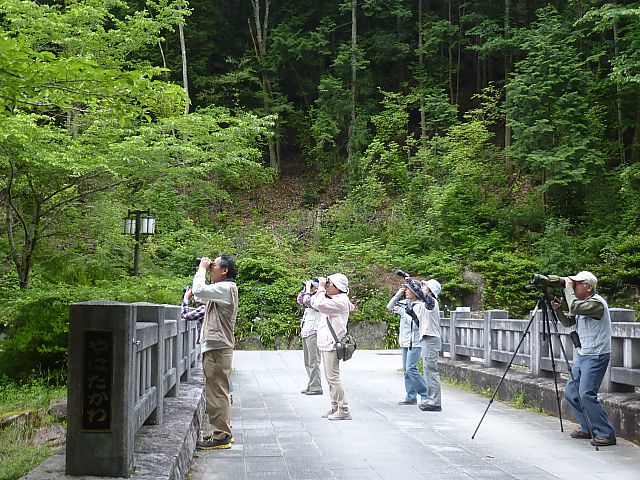 | 毎年恒例の佛通寺・御調八幡宮の探鳥会です。この2つの場所は三原の観光名所ですが,野鳥の世界でも自然に恵まれたいい場所です。 まずは佛通寺に行きました。 駐車場に着くとキセキレイが出迎えてくれ,木の梢でさえずっていました。開山堂まで歩いているとキビタキの声がいろいろな場所で聞こえてきます。姿も何人かの人が見ましたが,繁った樹木の中にいるため,全員がじっくりと見ることはできませんでした。 アオゲラが作ったと思われる古巣もありました。しかし,今年は使っていないようです。枝を使って深さを調べた方によると,40pぐらいあったようです。この他,キビタキのイカルのさえずり共演があり,2種のさえずりの違いが初心者の方にはよく 分かったようです。オオルリも遠くで鳴いてましたが,姿は見えませんでした。早めに戻ったグループは,オオルリの姿を堪能できたようです。 御調八幡宮に移動し,探鳥を再開しました。 ここでもオオルリなどの声はしますが,なかなか姿を見ることはできません。今日はイマイチだなあと思いつつ歩いていると,何やらいた様子。静かに近づいてみると,巣箱にムササビがいたようです。ムササビが巣箱に入っているという情報はいただいていましたが,実際に見るのは初めてです。ただ,この時は一人しか見ることができませんでした。別の巣箱には,シジュウカラが入っていました。 オオルリもようやく姿を見せてくれました。美しいさえずりとともに姿もばっちり全員見ることができました。帰り際に再度ムササビが入っている巣箱に寄ってみると,なんともかわいらしい顔を出してくれていました。この時は多くの人が見ることができました。 最後にブッポウソウを観察に行きました。最初は1羽かと思っていたものの飛んで行った先にもう1羽のブッポウソウ。どうやらペアリングができているようです。去年はもう一つがいいたそうなので,これからどうなるでしょうか? 今日のメインであるサンコウチョウ。詳しくは書けませんが,とある2か所でサンコウチョウの声を聞くことができました。ただ,1か所は一人だけ。もう1か所も数人しか確認することができず,残念でした。でも,帰る途中に見た家の軒下に営巣したオオルリの巣!これにはびっくりしましたね!(下の写真) 【観察種】 合計 33種 +2種 ~~~~~~~~~~~~~~~~~~~~~~~~~~~~~~~~~ カルガモ キジバト カワウ アオサギ ※ダイサギ トビ ブッポウソウ コゲラ アオゲラ サンコウチョウ ハシボソガラス ハシブトガラス ヤマガラ シジュウカラ ツバメ コシアカツバメ ※イワツバメ ヒヨドリ ウグイス エナガ センダイムシクイ メジロ ※ムクドリ ※イソヒヨドリ キビタキ オオルリ スズメ キセキレイ ハクセキレイ セグロセキレイ カワラヒワ イカル ホオジロ 番外 コジュケイ ムササビ |