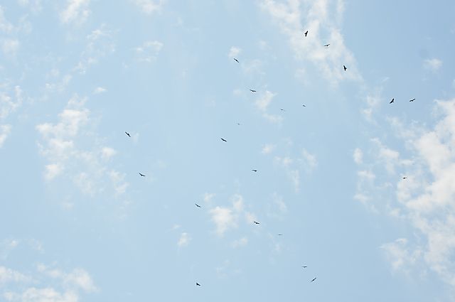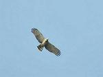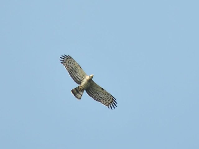 | 当初の予定では22日の水曜日でしたが,あいにくの雨。それも結構降っていたので野鳥の会広島県支部の探鳥会は中止,三原野鳥の会は土曜日に延期となりました。雨模様が続いているので,ハチクマがたまっているはず。期待して出かけました。 私は少し早めに新山に着き,8:15から観察開始したものの,三原野鳥の会のみなさんが来るまでは,たったの2羽しか渡っていませんでした。皆さんが到着され,探鳥会開始となり私が説明を始めた途端,タカが渡り始めました。みなさんが,タカを連れてきてくださったようです。この時は近い所を十数羽のハチクマや1羽のサシバが渡り,気持ちよくスタートを切ることができました。 次の興奮は11時ごろ。東側に30羽近くのタカ柱ができ,歓声が上がりました!この日は,佐伯運動公園でも渡っており,ピークだったのかもしれません。 その後は,あちこちにタカ柱ができるものの,かなり遠くだったのでイマイチでした。ただ,数は出ていたので,最終的には285羽のハチクマとサシバ,ツミをカウントすることができました。ツミは,1羽のハチクマを執拗にモビングしており,いつもどおりのやんちゃぶりを発揮していました。(^^ゞ 前半はなかなかよく,これは出るかなと思いましたが,後半は尻すぼみでした。でも,全体的には数も出たので,よかったと思います。 【観察種】 合計 種 ~~~~~~~~~~~~~~~~~~~~~~~~~~~~ キジバト ミサゴ ハチクマ トビ ツミ サシバ コゲラ ハシボソガラス ヤマガラ ツバメ イワツバメ ヒヨドリ メジロ カワラヒワ ○渡り記録(8:15〜15:00) ハチクマ 282羽 ツミ 1羽 サシバ1羽 合計 285羽 |
