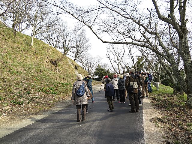| 三原野鳥の会での探鳥会はもちろんのこと,中央公民館の教室でも3月の「筆景山」「葉田竜王山」は初めてです。狙いは「ウソ」。ここでは以前から桜の花のつぼみを食べにウソが来ており,普段はあまり見ることがないウソに期待がかかります。 いつものように中央公民館に集合すると,電線にイソヒヨドリの♂がとまり,きれいな声で囀り始めました。その横にも♂が1羽いたので,テリトリー争いをしていたのでしょうか?公民館を出発し,沼田川を渡るとき,ミサゴがハンティングをしていました。河口付近にはヒドリガモやマガモがおり,幸先がよさそうです。 最初に標高445mの「葉多竜王山」に行きました。下の駐車場に着くと,駐車場が新しくなっていました。(写真)この3月末に「竜王みはらしライン」が開通し,バスも通れるようになるということで,広げられたのだと思います。ここに車を停めて頂上の展望台を目指して歩いていると,すぐに目当てのウソが現れました。2羽の♂がサクラのつぼみを食べているようです。胸から下もうっすらと紅色で,亜種のアカウソでした。この2羽はしばらく同じサクラの木にとまって,みんなを楽しませてくれました。(下の写真のアカウソ) ここ葉多竜王山ではウソの他に,シジュウカラやコゲラ,エナガの混群も見ました。その中で1羽のエナガは,長い尾羽がない個体でした。何か事故でもあったのでしょうか……?元気良く飛び回っていたので,早く尾羽が生えてくるといいのですね。 次は,もう一つの探鳥地「筆景山」に移動しました。着いた時が11時半ごろだったので,役員の方々が用意してくださった弁当を食べました。どうもありがとうございました。私は数名の方と下の東屋で昼食をとっていたところ,目の前にタカが現れました。ハイタカか?と思って双眼鏡をのぞくと,なんとチョウゲンボウでした。この場所で,チョウゲンボウを見るのは初めてです。 昼食をとった後,頂上の展望台付近に行くと,みなさん双眼鏡をのぞいておられます。話を聞くとウソやイカルがいるとのことで,見るとウソの♀がいました。また,アトリが出たとのこと見に行くと,アトリの♂がいました。このアトリは頭が黒くなり始めていて,春だなと感じさせる個体でした。(写真のアトリ) 最初にイソヒヨドリが出たときは,前々回の笠岡探鳥のようにイマイチになるかと危惧しましたが,今回は山の鳥ながらみなさん十分見ることができ,なかなか良い探鳥会になりました。 あっ,そうそう,途中でトキやペリカンも見ました。ハクトウワシなども……。 実は筆影山の麓に三菱の工場があり電車を作られています。その電車の車体にトキやペンギンがペイントされていたのです。いったいどこへ納入されるのでしょうか?ご存じの方は,おられませんかね?(下の写真) みなさん,1年間ありがとうございました。来年度もよろしくお願いいたします。 【観察種】 合計 27種 ~~~~~~~~~~~~~~~~~~~~~~~~~~~~ ※ヒドリガモ ※マガモ キジバト ※カワウ ※ミサゴ トビ ハイタカ コゲラ チョウゲンボウ ハシボソガラス ハシブトガラス ヤマガラ シジュウカラ ヒヨドリ エナガ メジロ ムクドリ シロハラ ジョウビタキ イソヒヨドリ スズメ アトリ カワラヒワ ウソ(アカウソ) イカル ホオジロ カシラダカ |